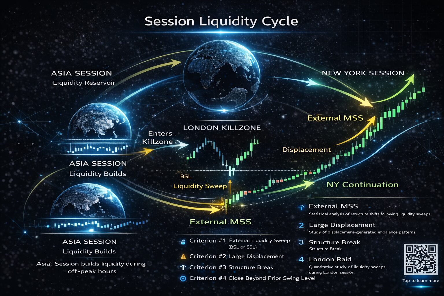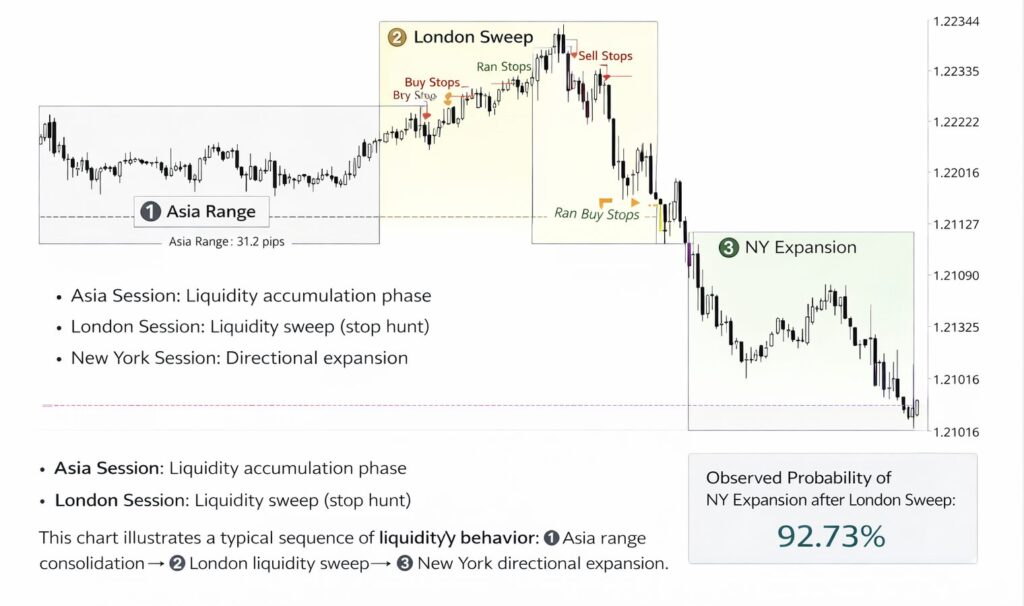The eXpeed Research Lab focuses on quantitative analysis of liquidity behavior and market structure events across global financial markets. Our research examines how liquidity accumulates, is swept, and leads to displacement events across major trading sessions such as Asia, London and New York markets.